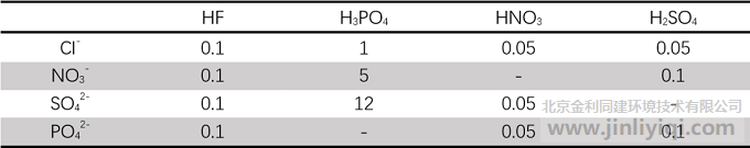 氫氟酸(HF)、磷酸(H3PO4)、乙酸(CH3COOH)均為弱酸,利用排斥柱Donnan原理,弱酸及有機酸在排斥柱上有保留而無機陰離子沒有保留的特點,我們采取柱切換的方式可以將以弱酸為基體的主成分切換掉,同時無機陰離子進入到濃縮柱中進行富集。再經過高容量色譜柱進行分離,可以準確測定氫氟酸與濃磷酸中無機陰離子含量,避免了高濃度基質的干擾,且檢出限可達10ppb。